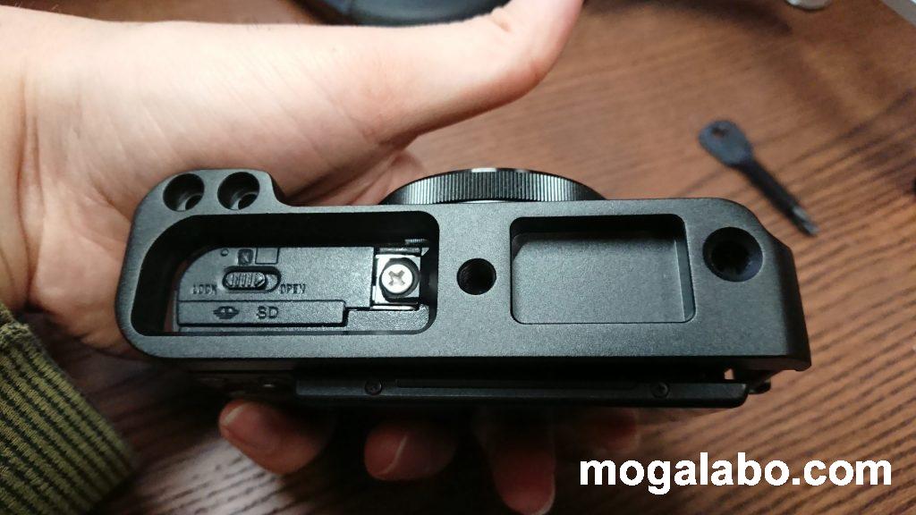 カメラ側の1/4のネジ穴がズレるリグをつけることにより、カメラ側の1/4のネジ穴がズレます。これによって、蓋への干渉がなくなります。