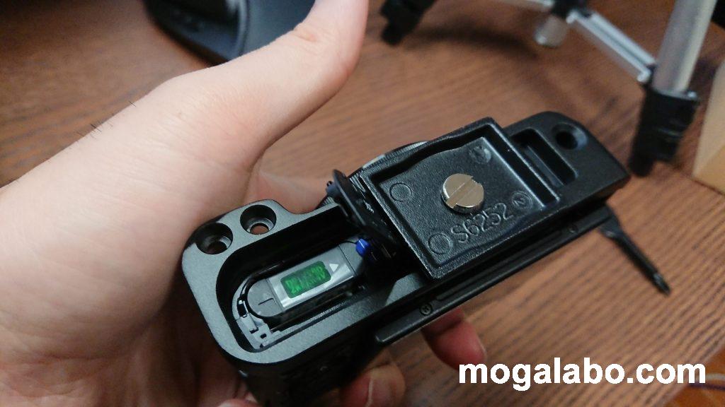 クイックシュープレートの方向を変更したら問題は解決ただ、クイックシュープレートの方向を縦方向に変えてやれば、蓋が干渉しなくなりました。これで、SDカード、バッテリーが無事取り外せるようになりました。