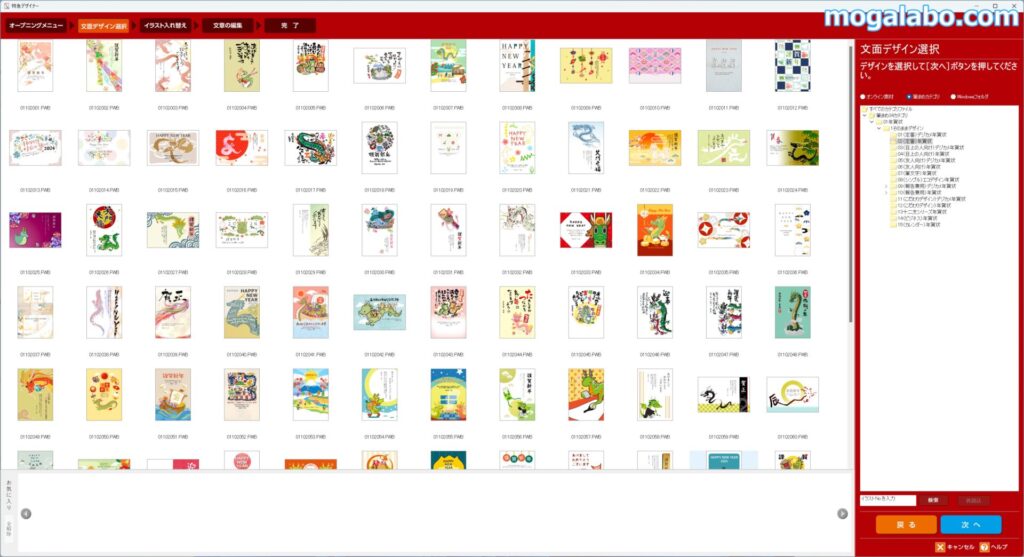 「筆まめ」の素材数は45万点、文例数は2,885と、その数は他のソフトを圧倒しています。素材や文例の選択肢がそれだけ多いので、自分がしっくりするデザインや文例に出会う確率が高まります。