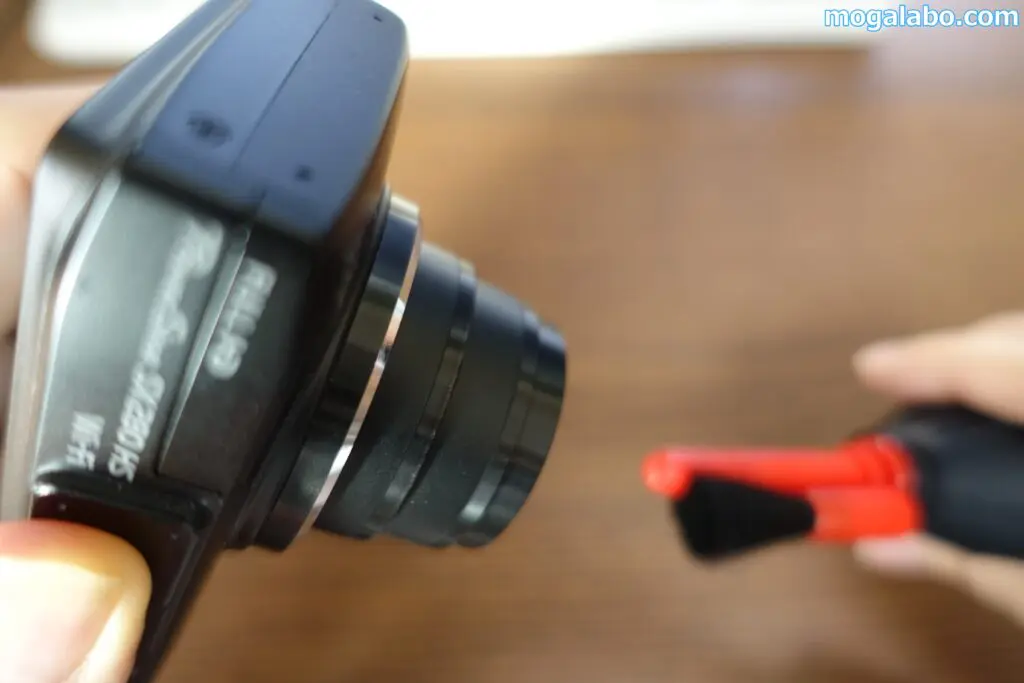 カメラのレンズを下向きにしてブロアーでほこりを飛ばします。