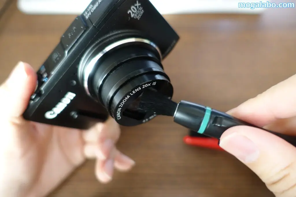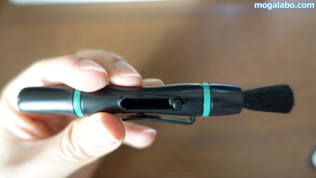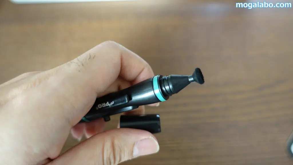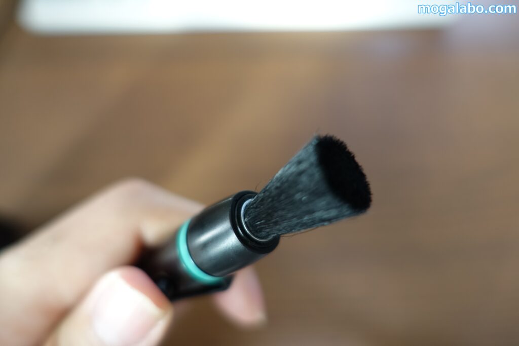レンズペン3ミニプロに格納されている上質山羊毛のブラシを使ってほこりを払います。