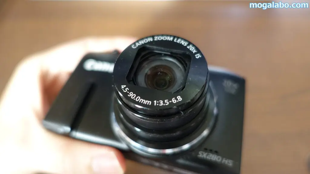 使用方法を解説する前に今回掃除するカメラを紹介します。2014年頃に発売されたキャノンのコンデジ、power shot SX280です。雑に扱ってるせいもあって、レンズがほこりだらけで汚いです。