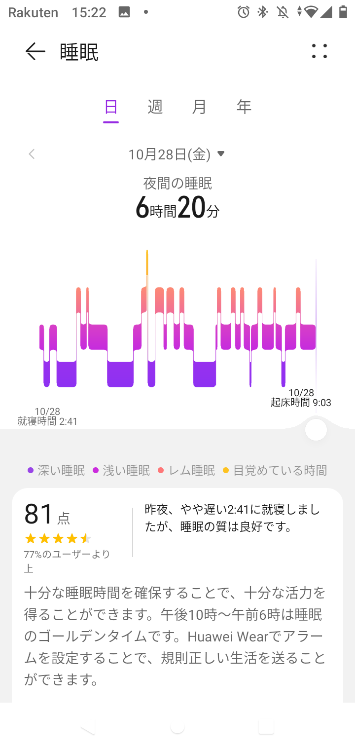 HUAWEI Band 6をつけたまま睡眠すると、自動的に「深い眠り」、「浅い眠り」、「レム睡眠」、「昼寝」の4つの異なる睡眠状態のいずれかを検出します。
