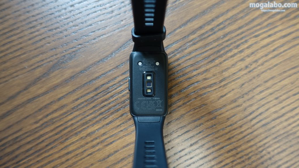 裏面です。心拍数等を測定するためのセンサーと充電口があります。