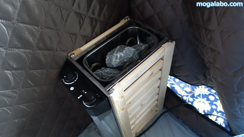 空焼きが終わったら再度電源をいれ、テントをしめきります。大体30分から60分ほど放置すると、サウナ状態になります。