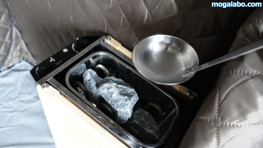 ロウリュを楽しむあとはサウナを楽しむだけです。そのままでも十分ですが、アロマ水をサウナストーンにかけて、ロウリュを楽しんだり、サウナストーンをさらに積み上げたり、温度を調節したりと、自分好みのセッティングでさらに快適にサウナを楽します。