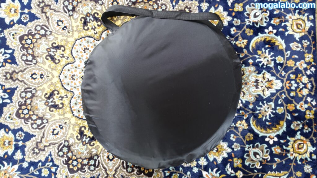 テントテントです。テントは収納袋に入っています。重量は2kgほど、収納状態でのサイズもW85×D85×H10cmなので、持ち運びが容易になっています。