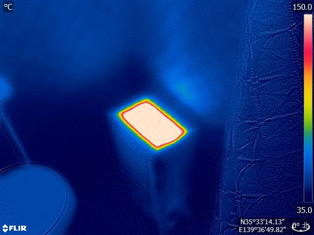 ただ、サウナストーブ本体はかなり過熱します。サーマルカメラで測定したところ、100℃を超えました。