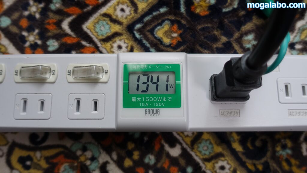 また、電源を入れると消費電力は1300Wを超えます。念のため、延長ケーブルではなく、コンセント直挿しがおすすめです。自分の使用している延長ケーブルでは限界が1500Wまでが許容範囲だったので、限界ギリギリでした。