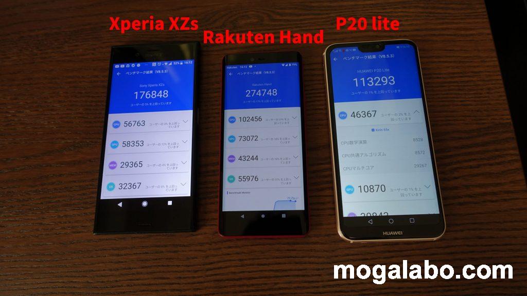 AnTuTuの結果です。楽天ハンドのスコアは274748です。こちらもGeekbench 5と同じく、P20 lite、Xperia XZsに圧勝しています。