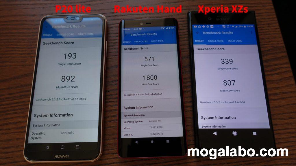 Geekbench 5の結果Geekbench 5の結果です。楽天ハンドのシングルコアのスコアは571、マルチコアのスコアは1800です。いずれの数値もP20lite、Xperia XZsに圧勝しています。