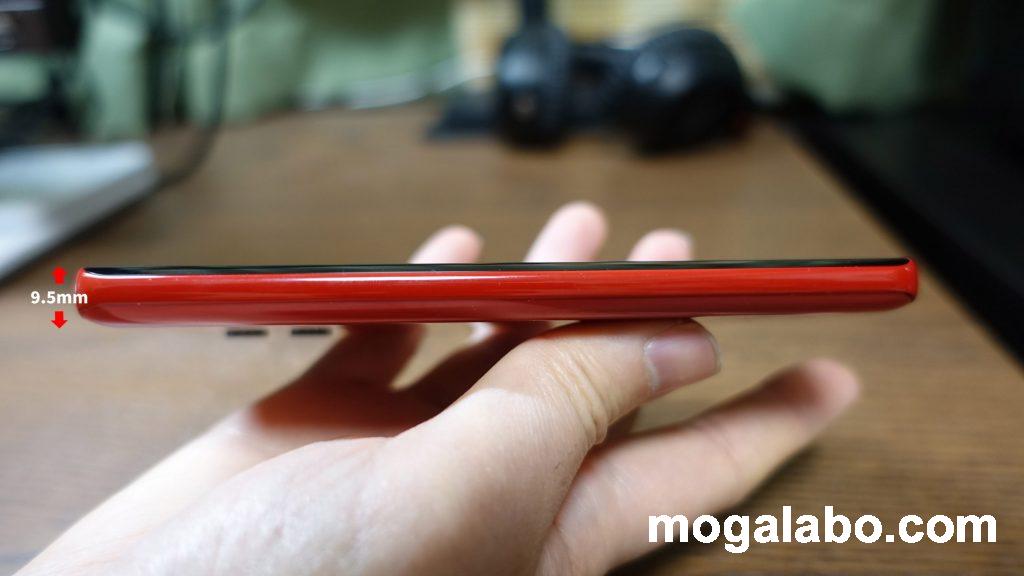 楽天ハンドの左サイド左サイドです。厚みは9.5mmです。eSIMなのと、SDカードに非対応ということでスロットは1つもなく、スッキリしています。