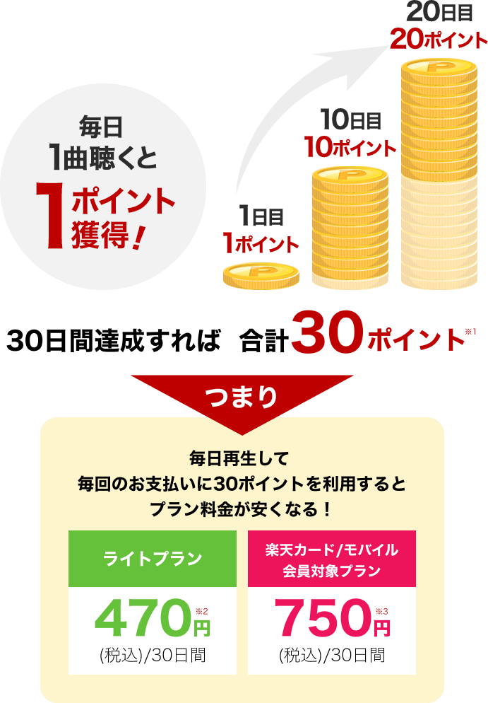 楽天ミュージックで毎日1曲再生すると、楽天ポイントが1付与されます。つまり、30日間続けると、合計30ポイントが付与されるということになります。