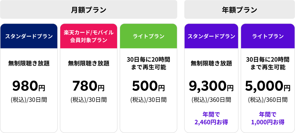 楽天ミュージックのプランは大きく分けて「スタンダードプラン」、「楽天カード/モバイル対象プラン」、「ライトプラン」の3種類あります。