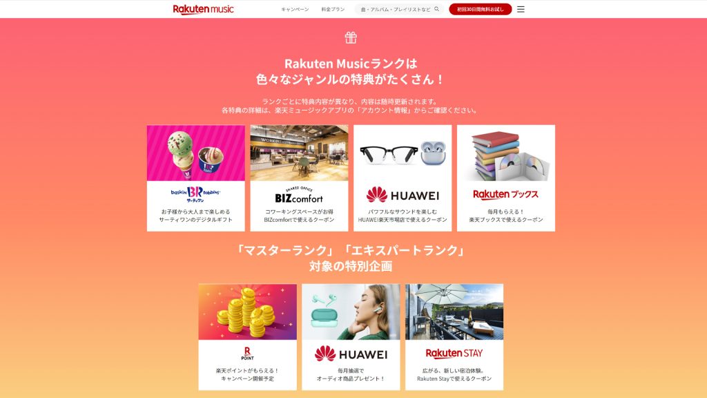 Rakuten Musicランクとは、Rakuten Musicと契約して、継続使用することで、クーポンやプレゼントがもらえる制度です。