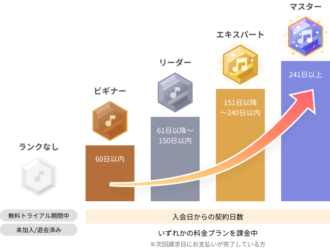 ランクアップの条件は非常にシンプルです。いずれかの料金プランを課金中で、各ランクに必要な日数を継続利用するだけです。