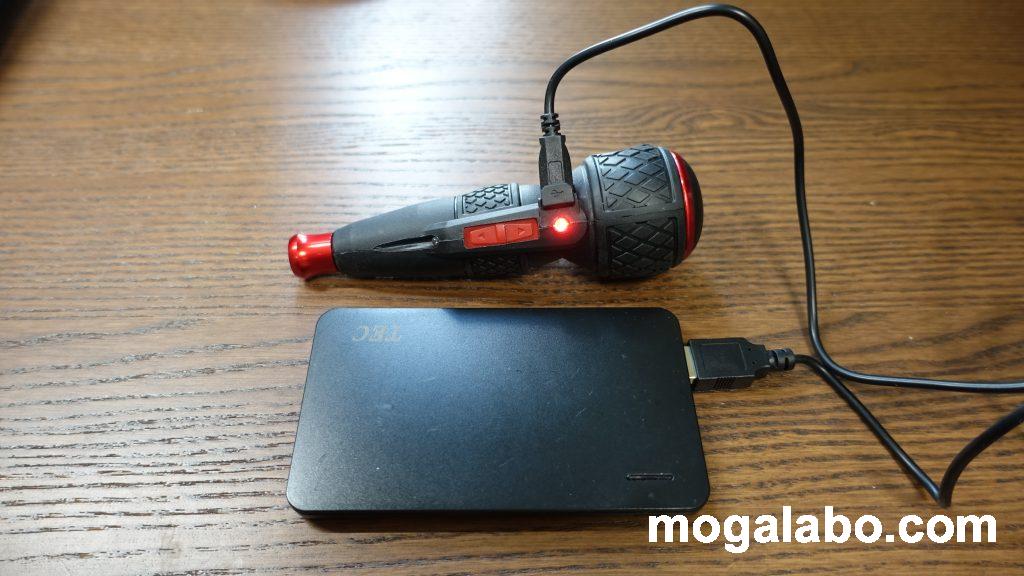 モバイルバッテリーからも充電できます。また充電中はLEDが赤色に点灯し、充電が完了すると緑色に点灯します。