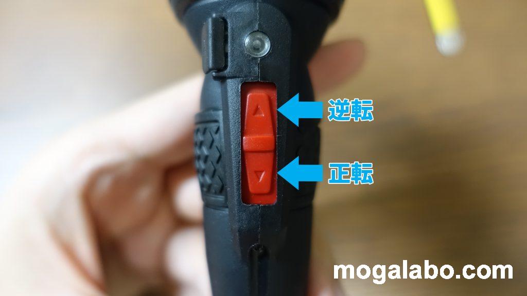 仮締め(早回し)する際は中央にある赤いスイッチをスライドさせます。正転(前方へスライド)で右回転、逆転(後方へスライド)で左回しになります。