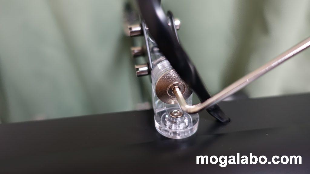 丸い筒状のセット金具を緩めると、挟み込む箇所が広がります。デスクに取り付ける際は締めつけて固定します。
